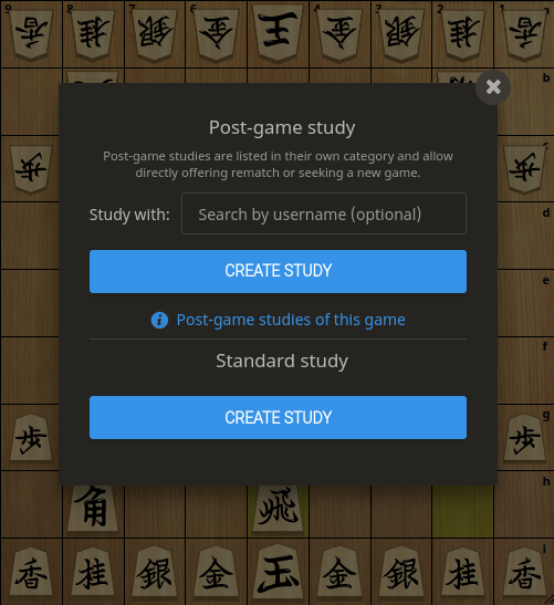 Starting a study after finishing a game was always kind of a cumbersome process. Now after you finish a game, you will see 'Study with opponent' button. Clicking this button will redirect you to a post-game study where you and the opponent have the right to contribute and study the game together. This button will always take you to the same post-game study.