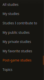 Post-game studies are just like studies with few small exceptions. Since these post-game studies might pile up, it wouldn't be good to display them in 'My studies' or other study categories. Therefore post-game studies are visible only in a new study category 'Post-game studies'.