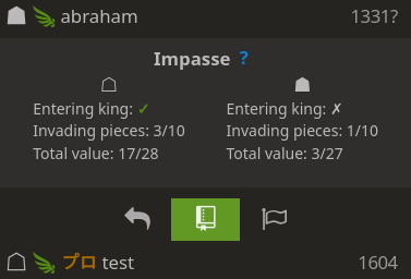 All of this is a lot of counting, therefore to make it easier for you to know how close you are to winning (or perhaps losing) by an impasse, we got an impasse calculator. It shows you whether your king has entered, how many pieces you have in the opponent's territory and the total value of those invading pieces and pieces in hand.